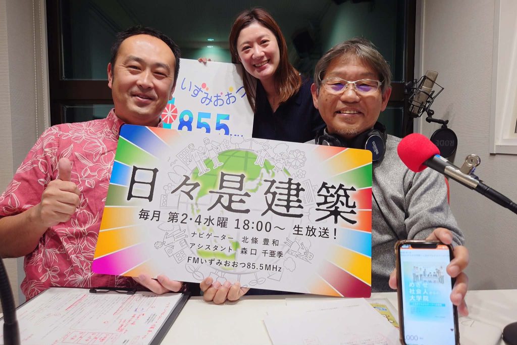 『日々是建築』は,毎月第2・4水曜の18:00〜18:55,FMいずみおおつ(85.5MHz)スタジオから生放送でお届け.(提供:健康生活KSB)