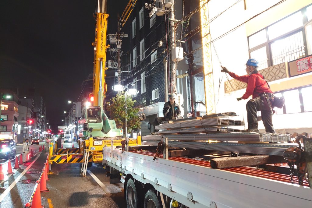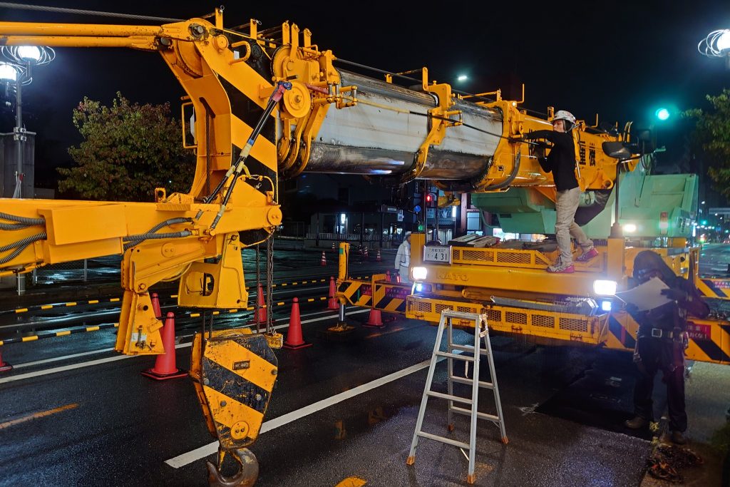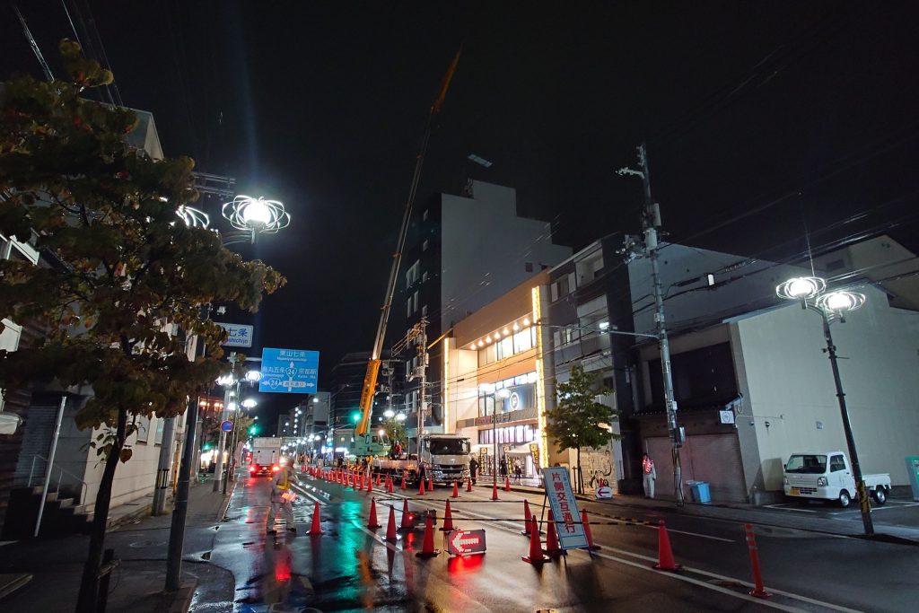 七条通りはバス通りで交通量も多いため、35tクレーンの据え付けは深夜になります.
