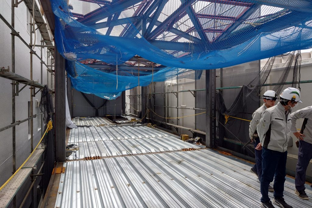 テナントビル(S造4階建て)新築工事,メインフレームの建て方は完了し屋根廻りの鳶工事が進行中です.