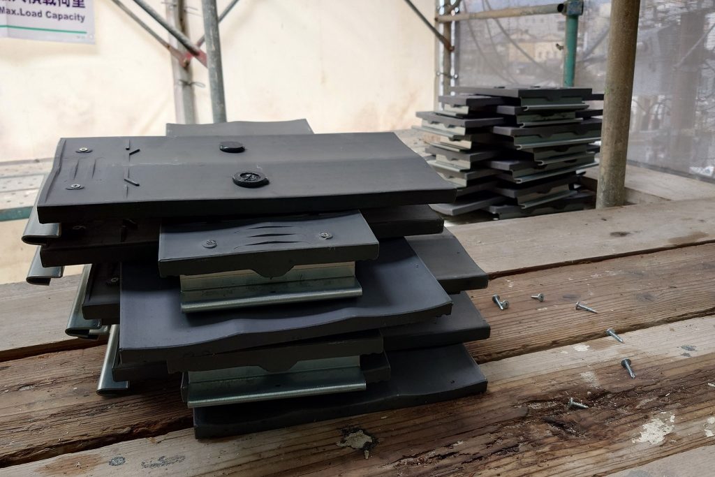 St-3.2 ZAM材 曲げ加工のファスナーを一つずつ瓦にボルト留めし、同じくSt-3.2 ZAM材の横胴縁に掛けていきます.