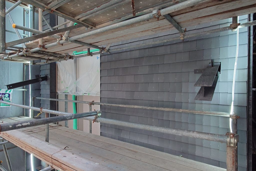 テナントビル(S造4階建て)新築工事,ファサードの瓦の取付けが8割ほど進んでいます.