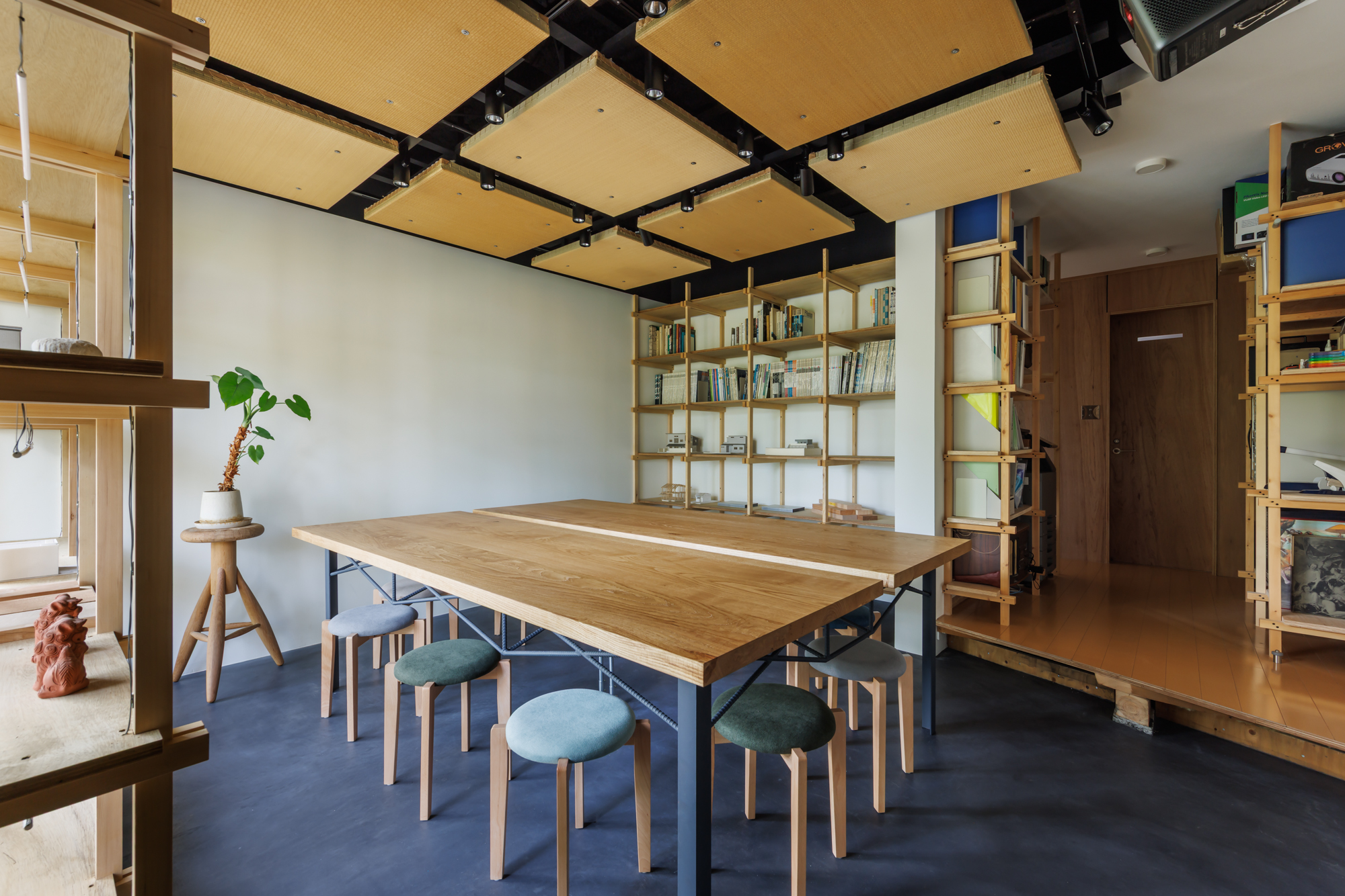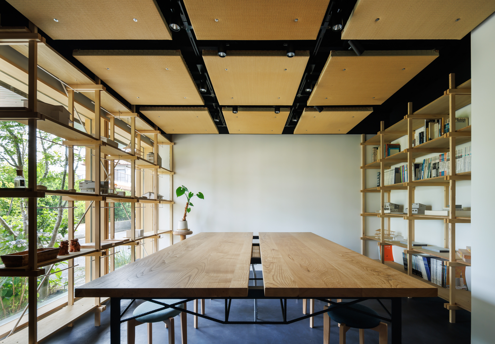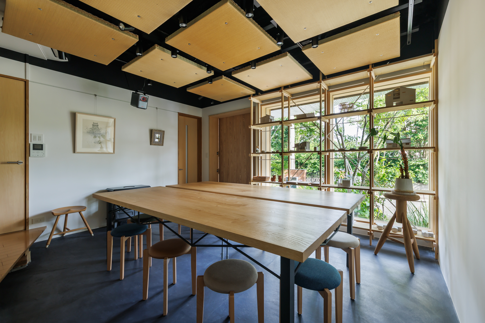 元和室の面影をなにか残せないか思案していたこともあり、オンラインを含めた大人数での会議や資料を広げて作業する際の音環境に配慮して、既存畳を吸音材として天井に吊った。