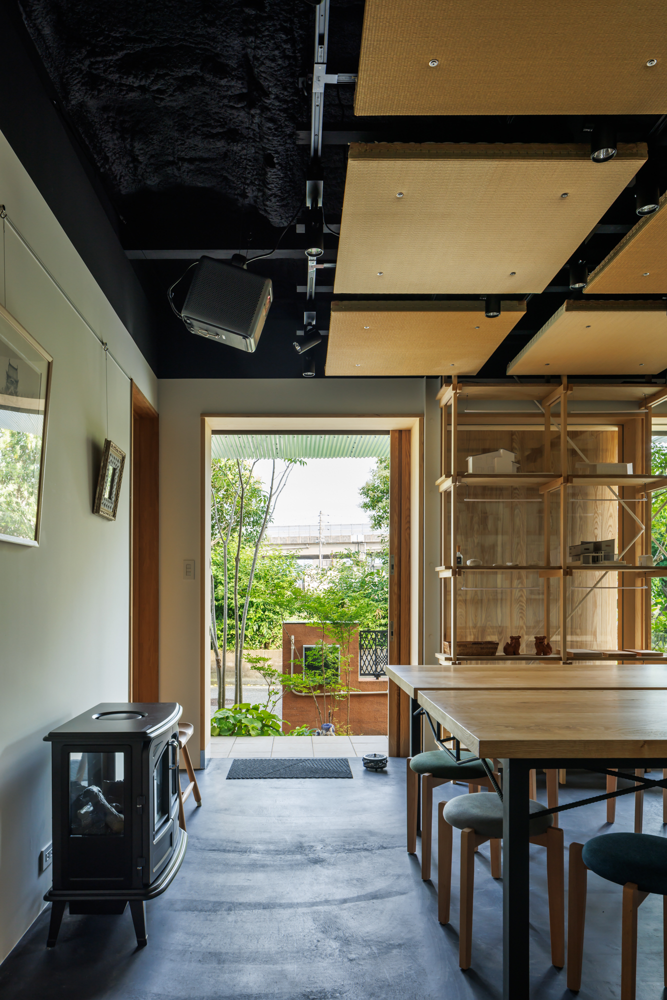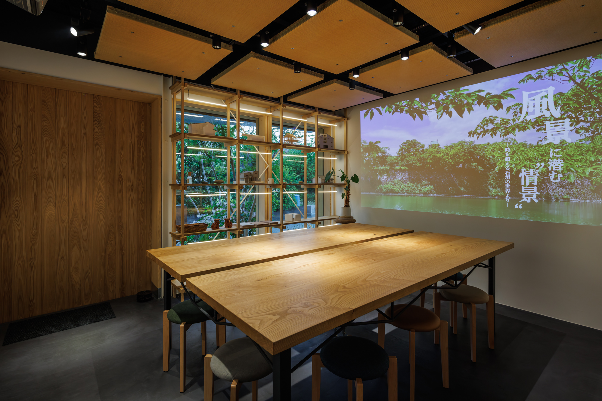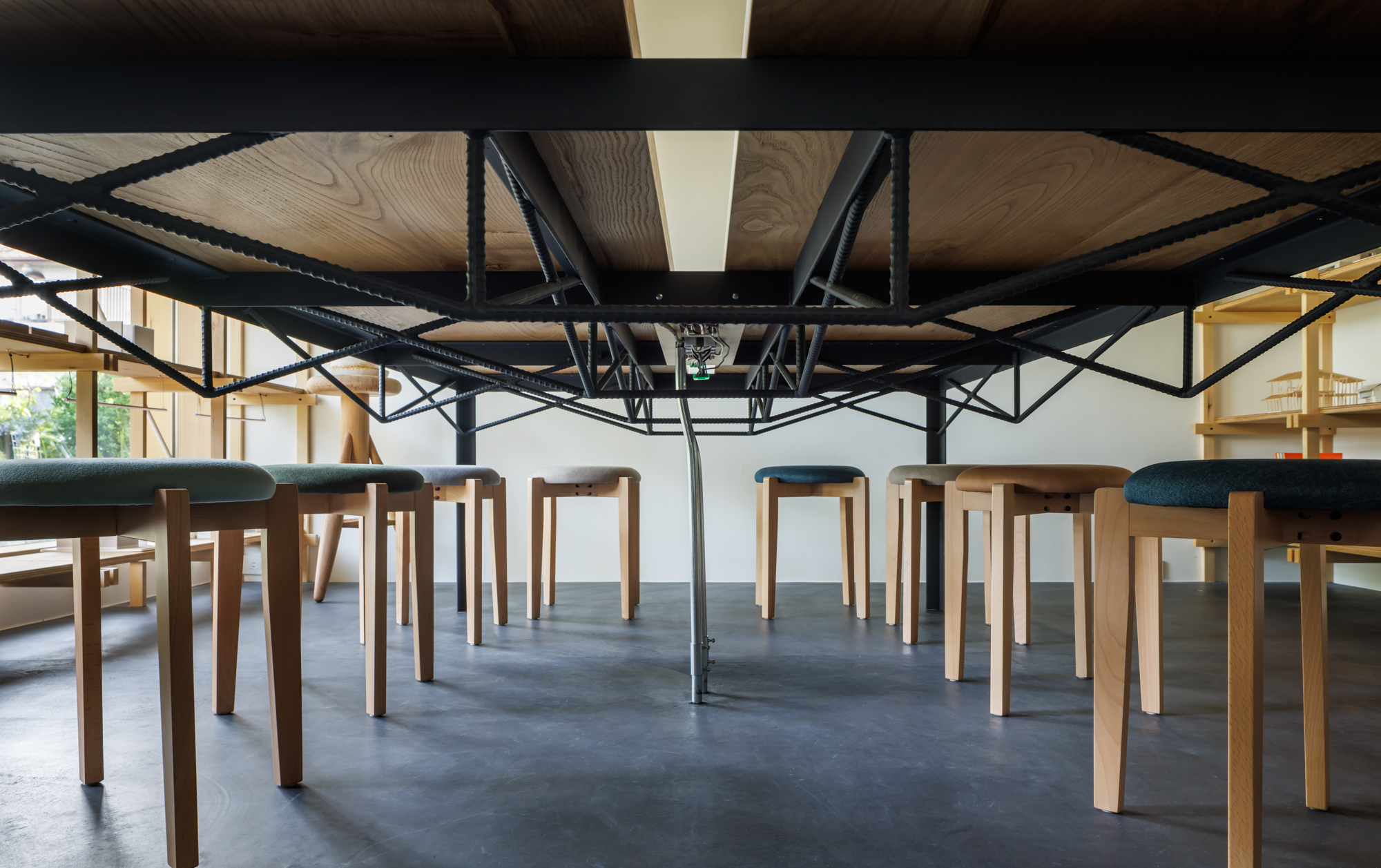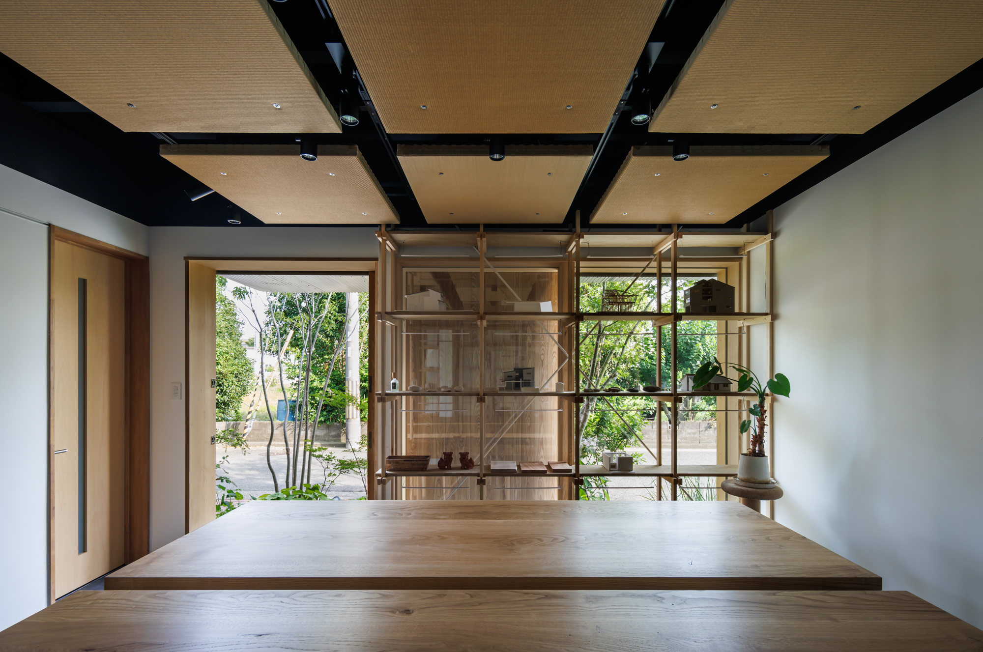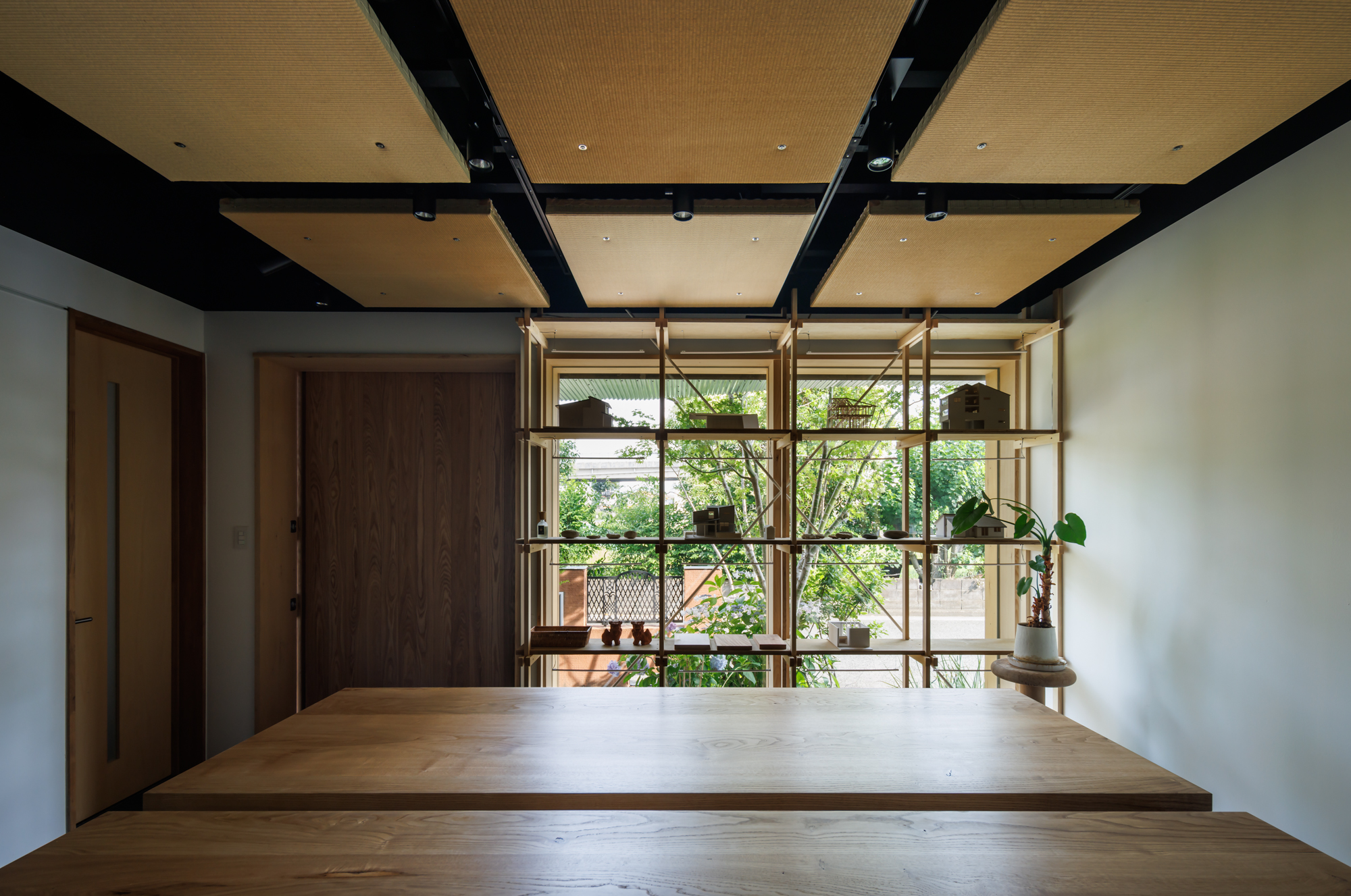 栗材天板の10人掛けテーブル(2400×1680)を中央に、都市環境や建築文化の研究施設として、既成市街における古家活用を牽引する事例となることを願う。