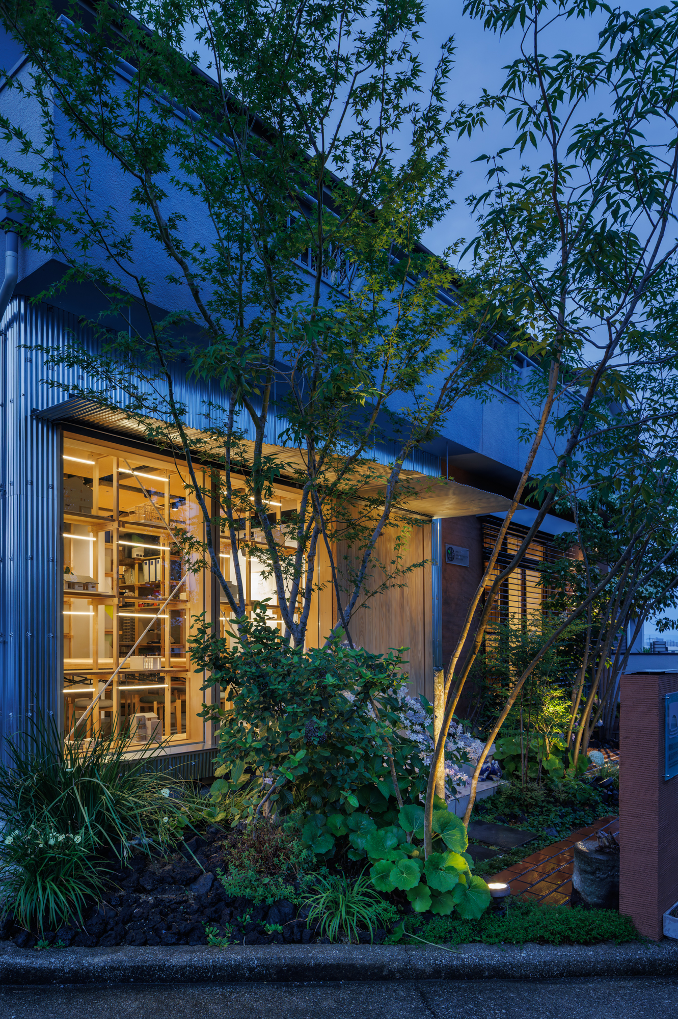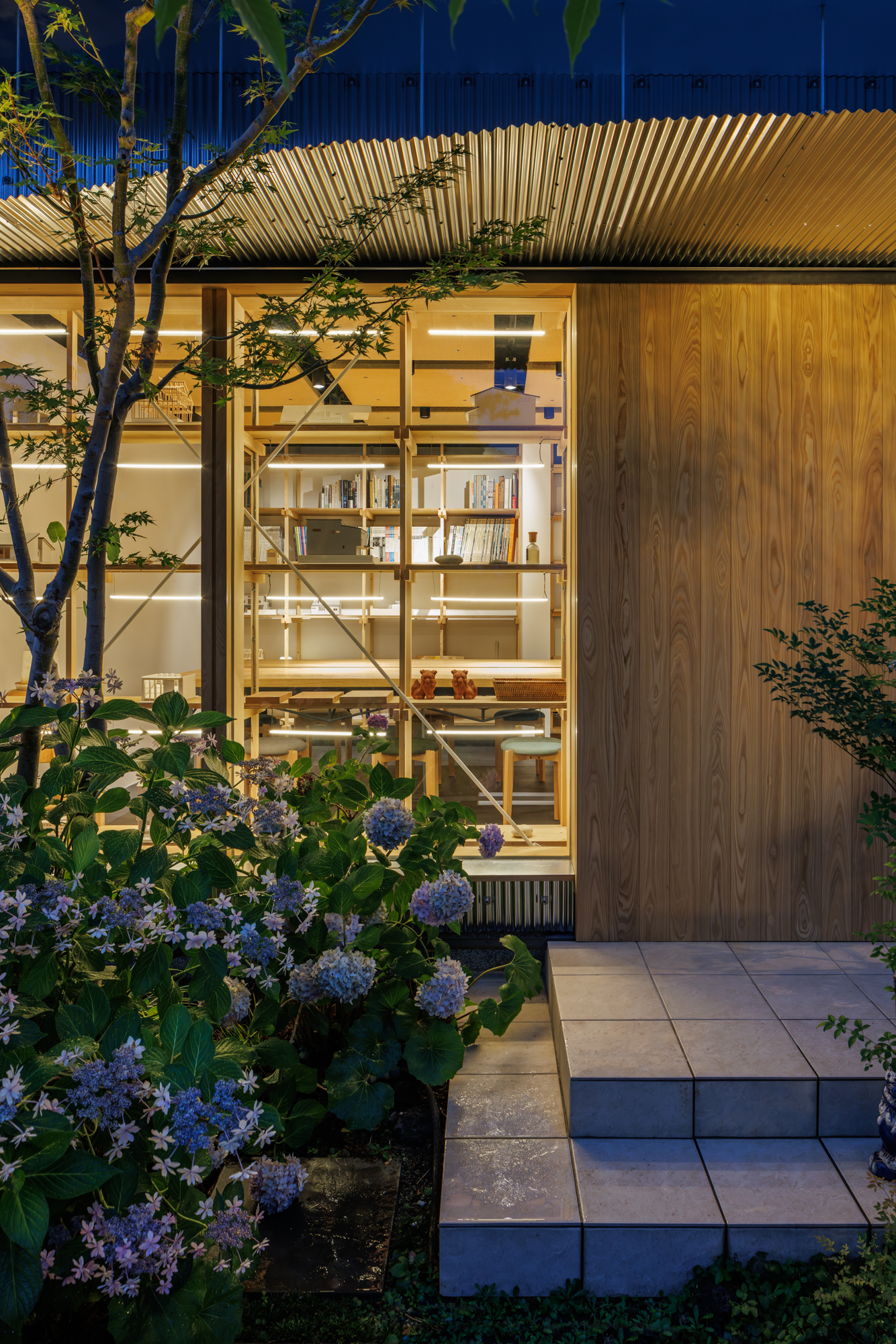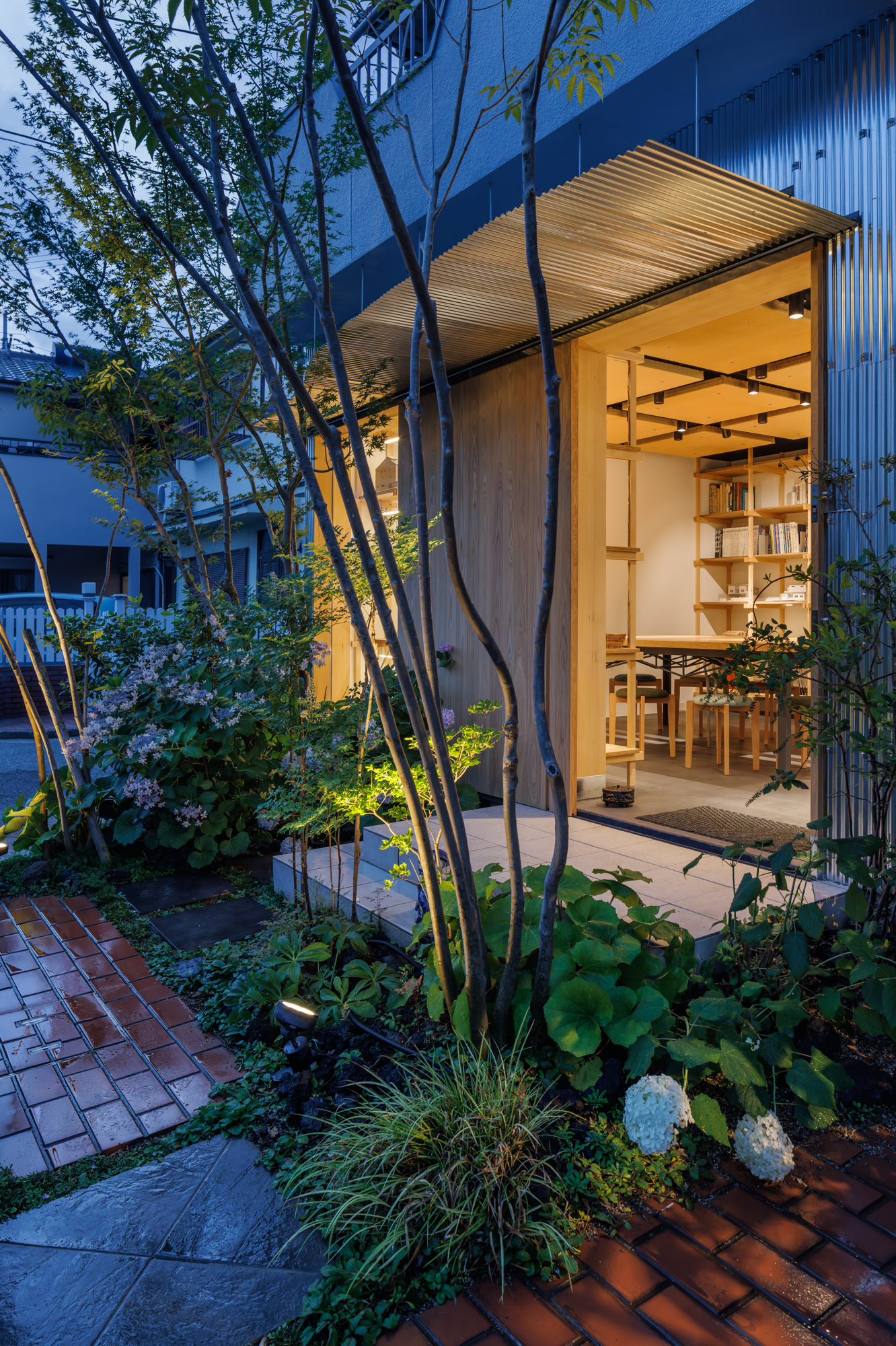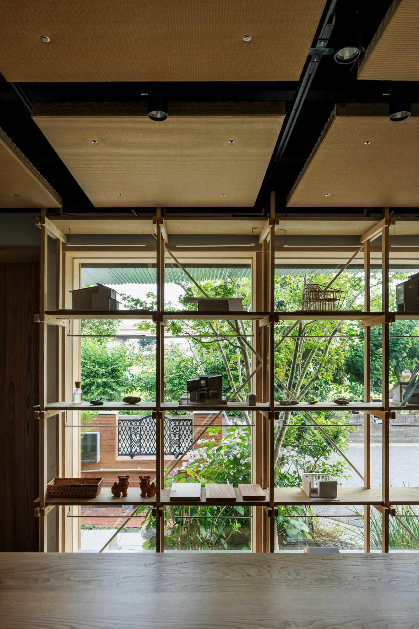所属研究員と協力研究員が自由活発に交流できるセミパブリックな空間として、入口はW1500の木製建具で建物内外をなめらかに繋ぐような構えとした。